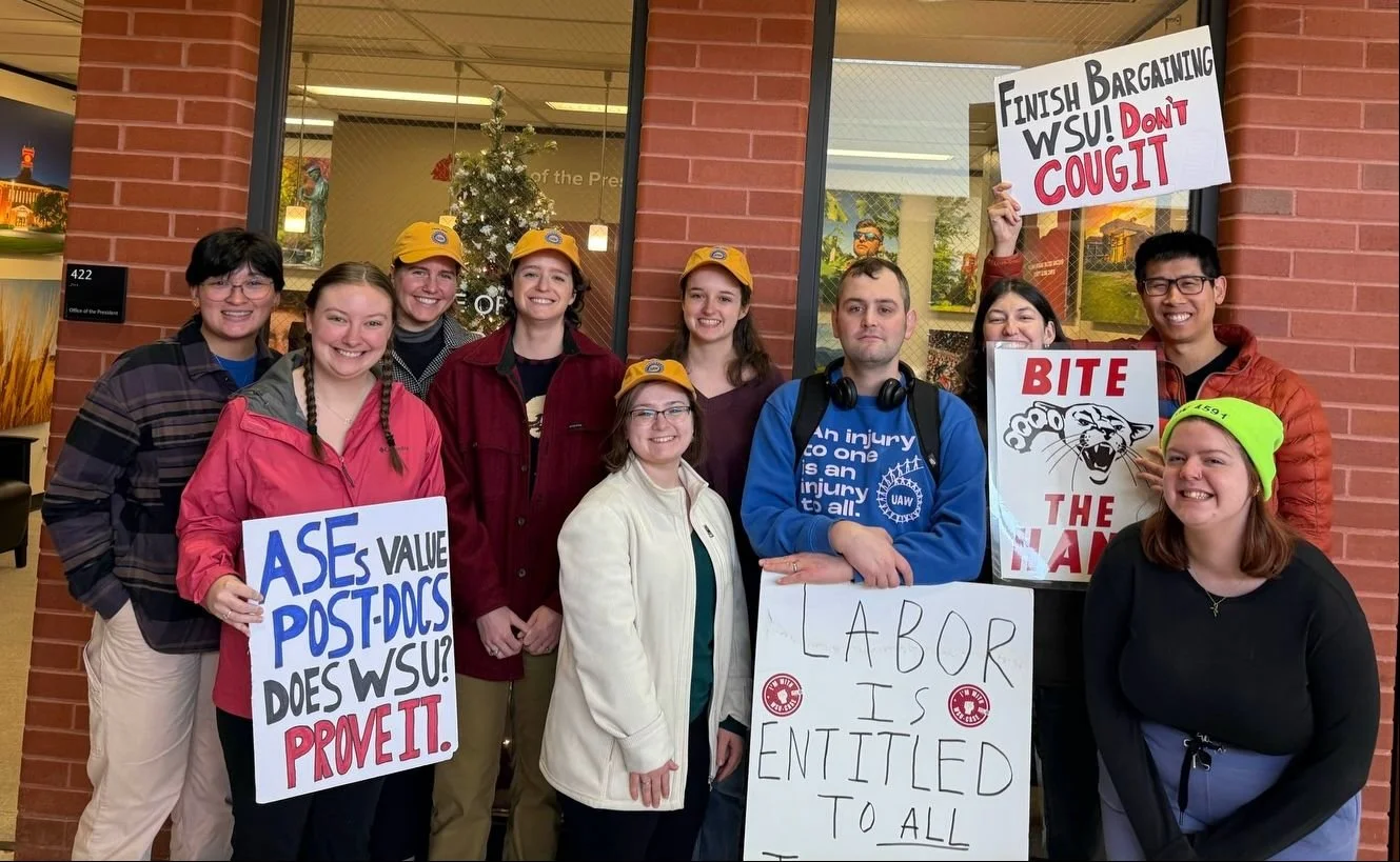 On December 12th, WSU Postdocs delivered a petition to WSU president Elizabeth Cantwell demanding that WSU bargain a fair first contract for Postdocs without any more delays. The petition was signed by a majority of Postdocs and calls on WSU to agree to compensation, job security and gender equity provisions consistent with other UAW Postdoc contracts. For the delivery, Postdocs were joined by ASEs members of Local 4591. WSU Postdocs have been bargaining for nearly a year and plan on continuing to organize and escalate to reach a fair contract that raises standards and improves research at WSU.